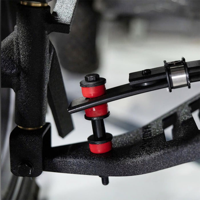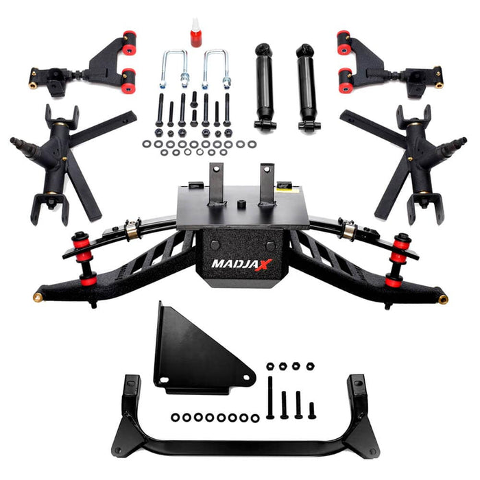 Conquer the neighborhood or the trail with this tough new heavy duty Yamaha Drive and Drive2 lift kit by the trusted team at MadJax®. Designed with the installer and customer in mind, this double a-arm lift kit will install in less time than a traditional lift kit. The front assembly incorporates the unique MadJax turnbuckle and jam nut design, making the camber/toe adjustment during the install easier than ever. This kingpin design replaces the traditional Heim-style joints, providing a simpler and more durable lift kit.