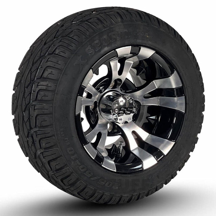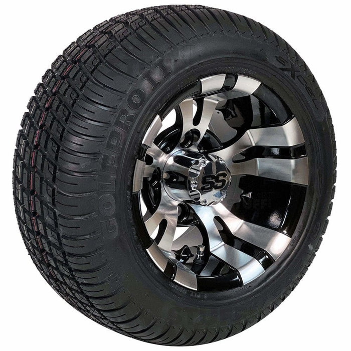 10" Vampire Black/Machined Aluminum Golf Cart Wheels and 205/50-10 DOT Street/Turf Golf Cart Tires Combo - Set of 4 (Choose your tire!)