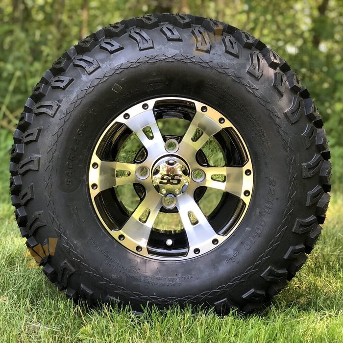 10" Stallion Black/Machined Aluminum Golf Cart Wheels and 22x11-10 Backlash All Terrain Off Road Golf Cart Tires Combo - Set of 4