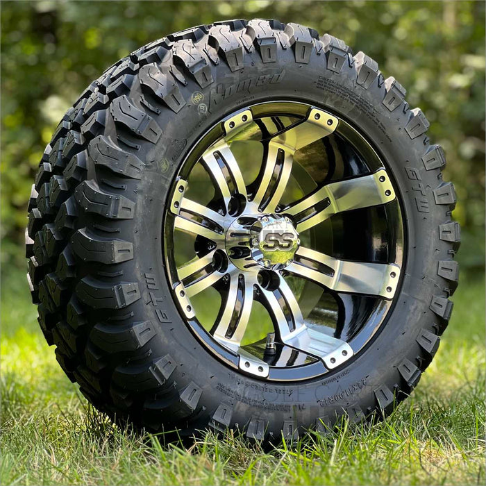 12" Tempest Black/Machined Aluminum Golf Cart Wheels and 22x11R-12 GTW Nomad DOT All Terrain Extreme Golf Cart Tires - Set of 4