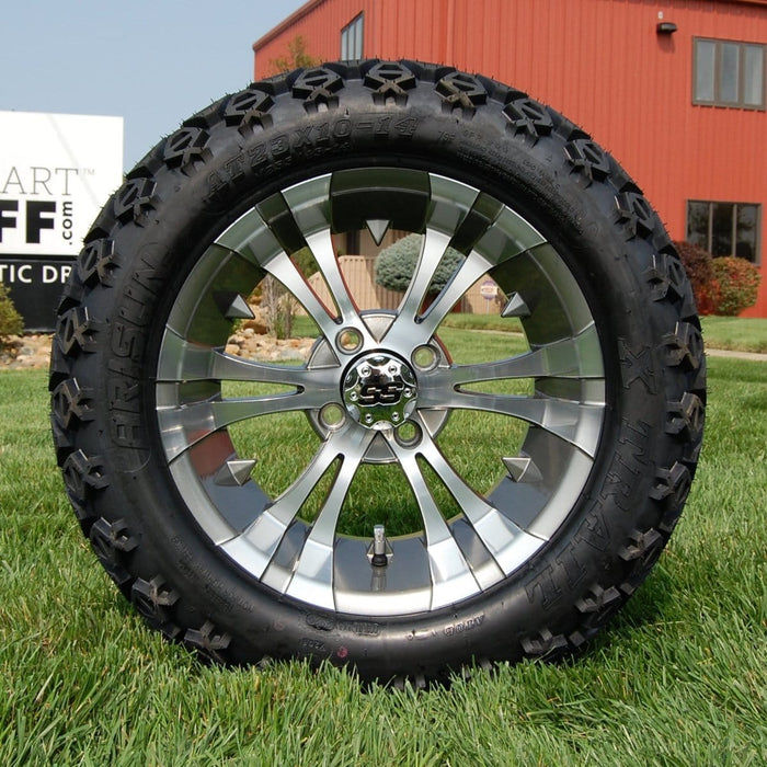 14" Vampire Gunmetal / Machined Aluminum Wheels and 23x10-14 DOT All Terrain Off-Road Golf Cart Tires Combo - Set of 4 (Choose your tire!)