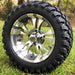 The 14" Vampire Gunmetal Gray & Machined golf cart wheel on the rugged 23" GTW Nomad or Sierra Rover Tire. You will not be able to comprehend the awesomeness until you unwrap these assemblies and start receiving a flood of compliments. The Nomad golf cart tire line by GTW (Gateway Tire & Wheel) is tough enough to handle the most extreme applications including rock, woods, and mud. Also available with the Sierra Rover steel belted radial. This 14" Golf Cart Wheel and 23x10-14 set will arrive quickly to your doorstep already being professionally mounted, aired up, and packaged with care. Unlock the next level of your golf cart with today!