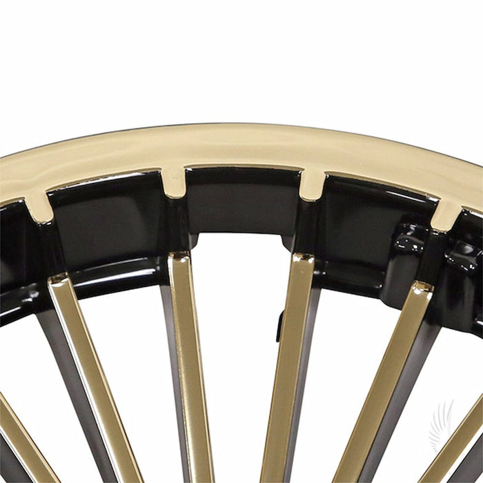 Turn heads with this stylish and unique gold and black hub cap! Standard golf cart wheels are only white or black and don't provide much opportunity to make your cart your own. Golf cart hub caps are a simple and easy way to add a personal touch to your golf cart without breaking the bank. This turbine style hub cap adds a sleek classic look to your golf cart in a matter of minutes.